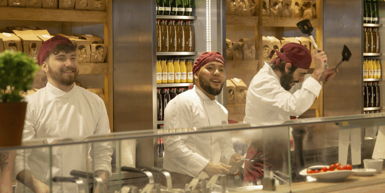 Imaginez des pâtes fraîches et des pizzas faites maison dans une cuisine ouverte ; regardez nos chefs préparer votre repas exactement comme vous le souhaitez. Plus de piment ? Bien sûr. Pas d’ail ? Aucun souci. Parfait pour tous les régimes alimentaires, les intolérances et les palais difficiles.