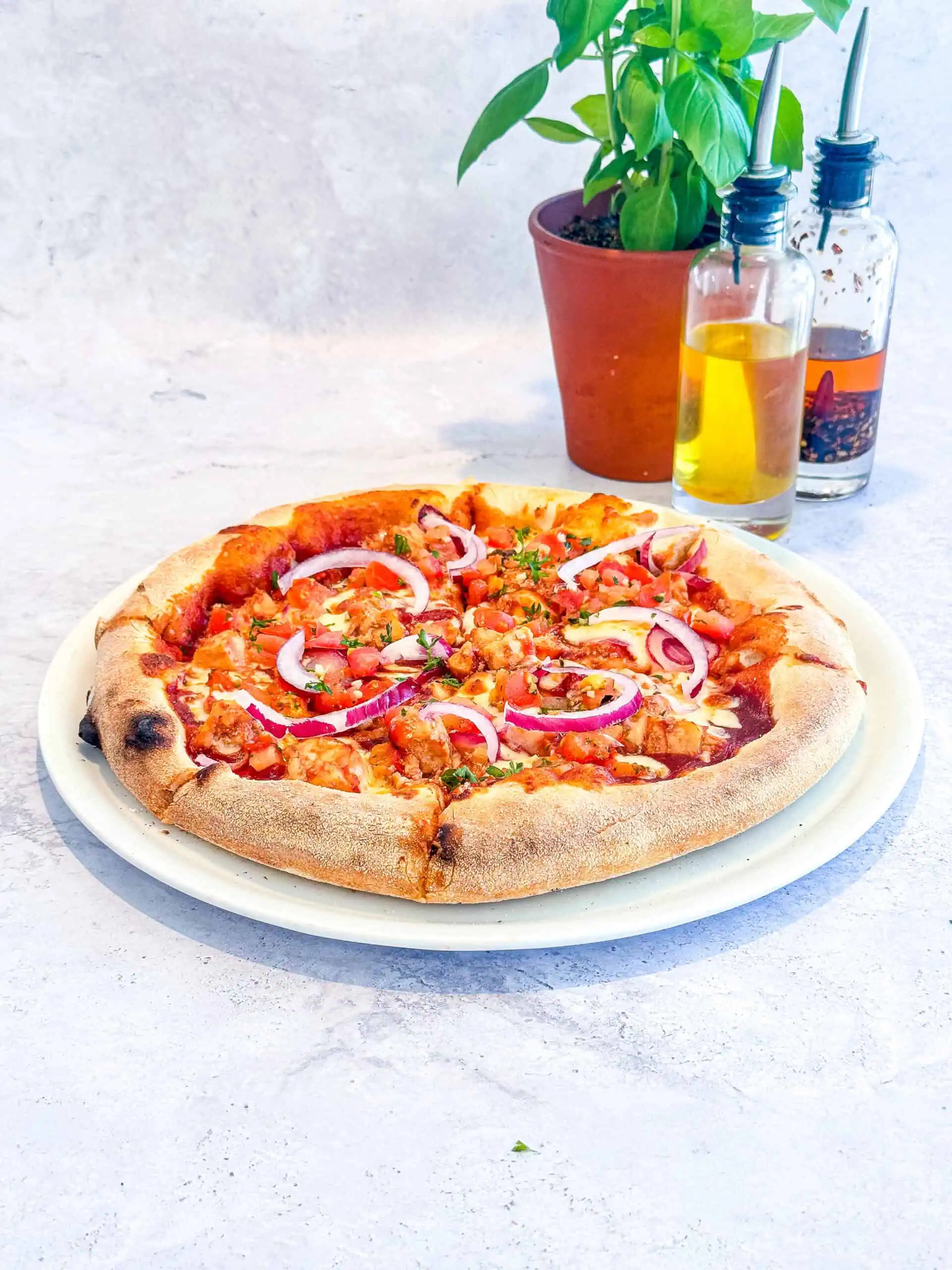 Bbq chickenBase tomate barbecue, mozzarella, poulet, tomates marinées huile d’olive et ail, scamorza, oignons rouges.