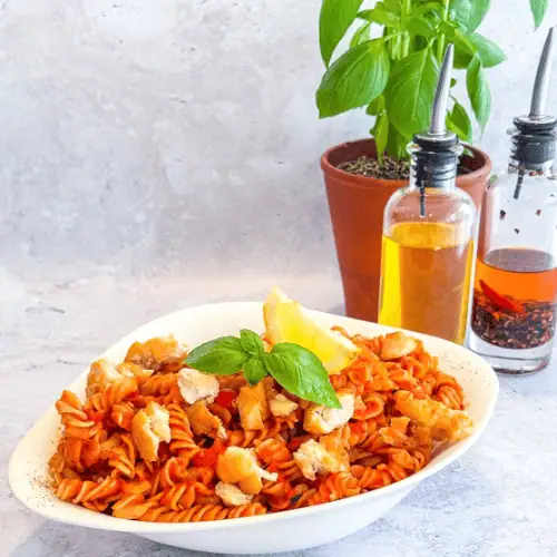 Chicken ArrabiataSauce tomate, poulet, oignon, poivron et piment confits, piment séché.