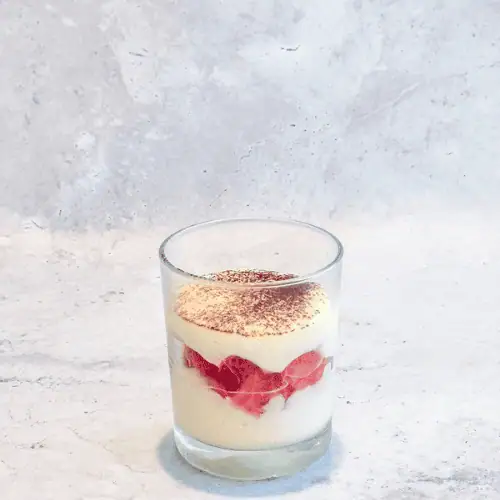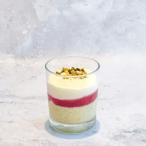 Tiramisu Pistache FraiseCrème de mascarpone, crème de pistache, coulis de fraise, biscuits à la cuillère à la fleur d’oranger, éclats de pistaches.