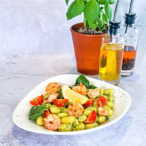 Gnocchi Scampi salmon e SpinaciCrevettes, saumon, sauce crème et fromage italien, pesto, oignons, tomates cerises, muscade, pousses d’épinards, citron