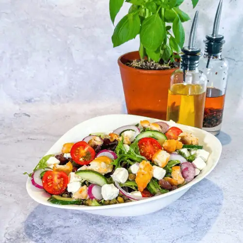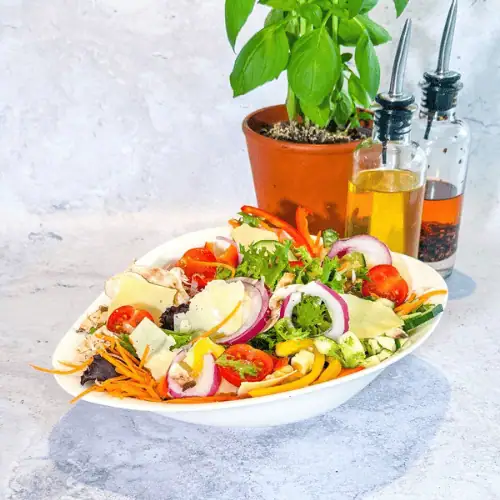Greco VegeMélange de salades, feta, concombre, tomates cerises, olives noires, câpres et oignons rouges.
