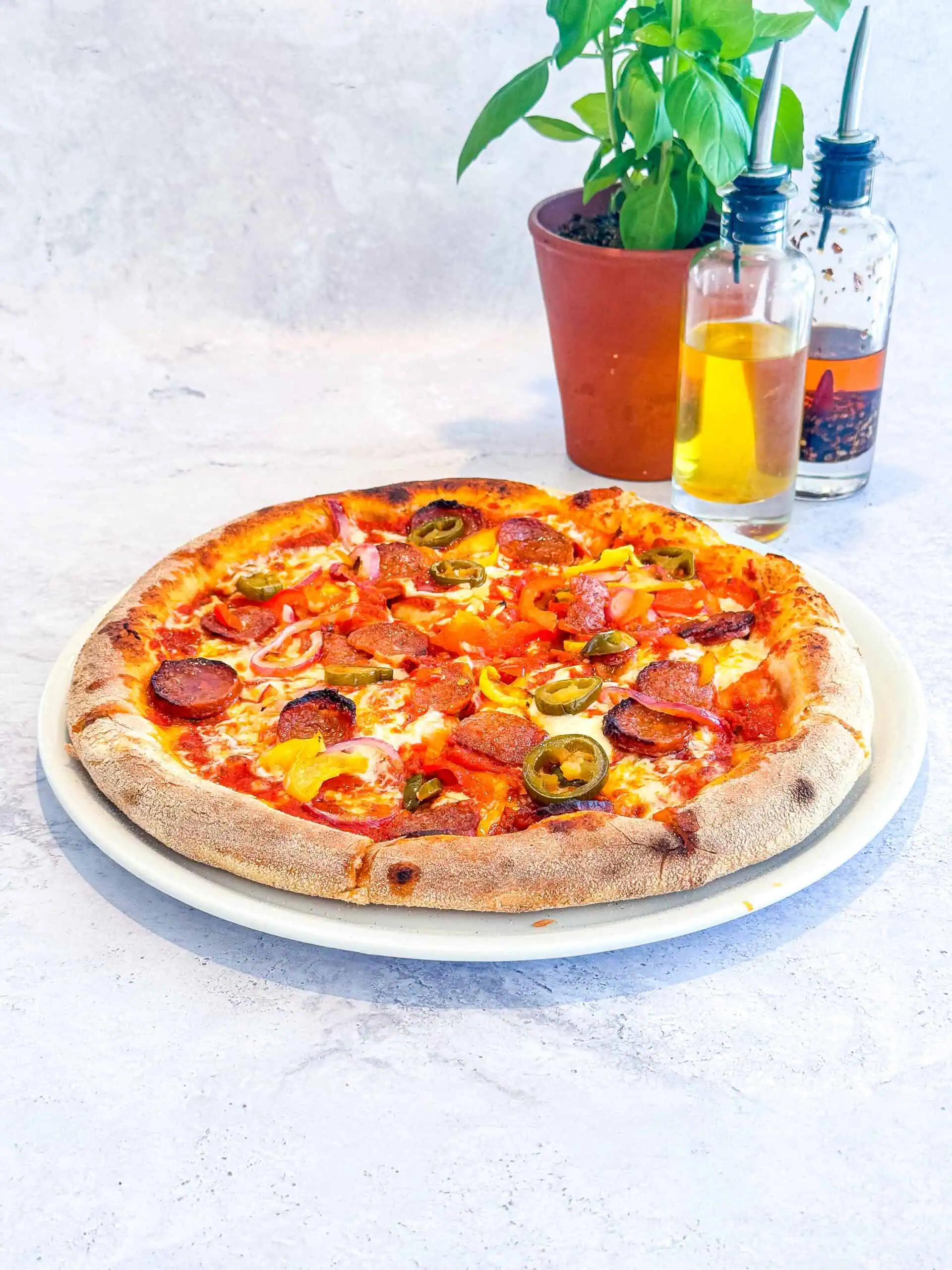 Chicken PiquanteBase tomate, poulet mariné, scamorza, mozzarella, tomate cerise, piment vert, poivron, oignon et piment confits.