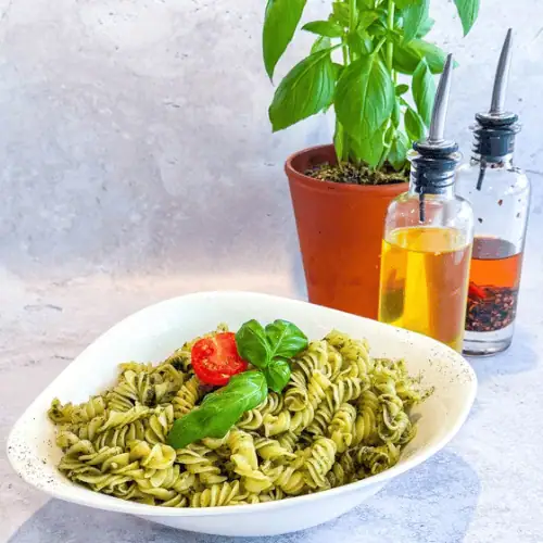 pesto basilicoPesto basilic fait maison, pignons de pin, servi avec fromage italien.