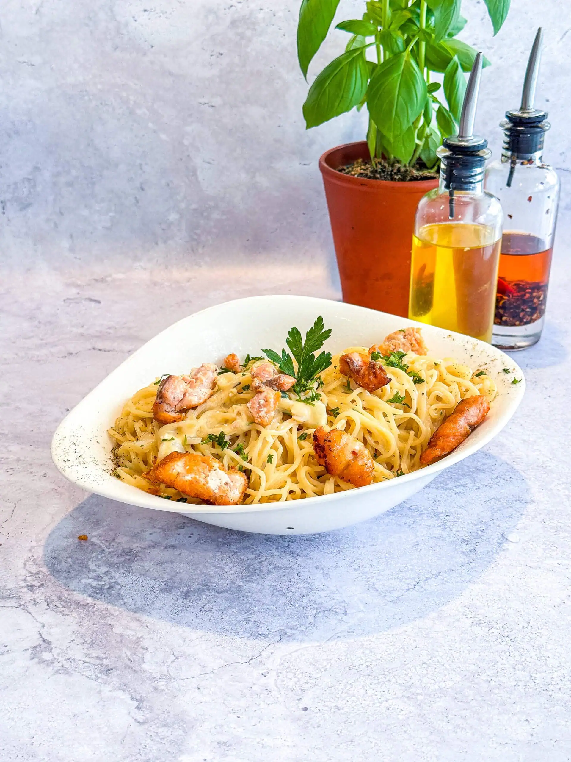 carbonara salmoneSaumon, crème, fromage italien, oignon, œuf, persil.