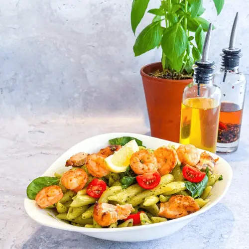 scampi e spinaciCrevettes, pesto, crème, fromage italien, oignons blancs, tomates cerises, muscade, pousses d’épinards, citron.