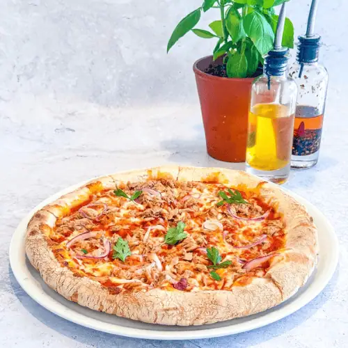 Pan TonnoBase tomate, mozzarella, thon, oignons rouges, persil.
